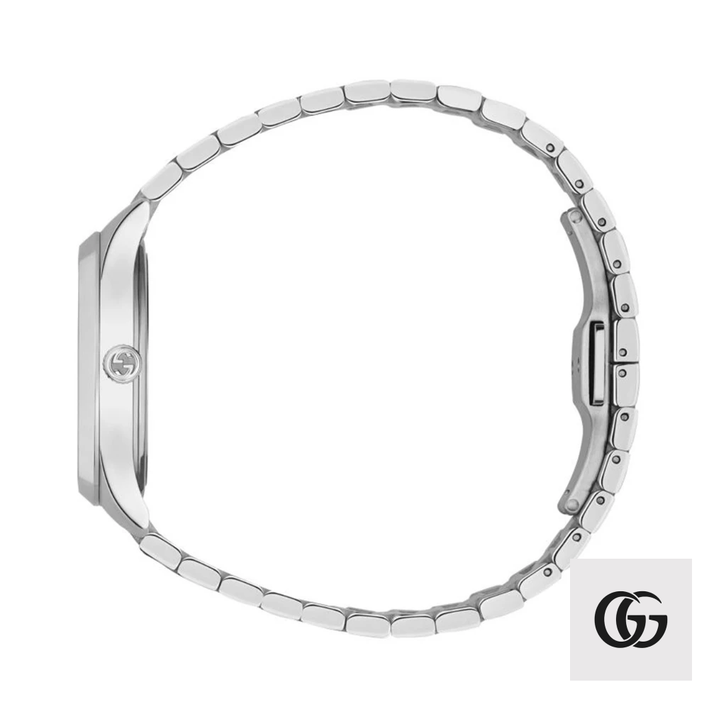 Vỏ và dây đeo bằng thép không gỉ tông vàng. Vành thép không gỉ tông bạc cố định. Mặt số màu hồng với kim và vạch chỉ giờ màu bạc. Vạch chỉ phút xung quanh vành ngoài. Loại mặt số: Analog. Bộ máy Quartz. Mặt kính sapphire chống trầy xước. Nắp lưng nguyên khối. Kiểu dáng vỏ tròn, kích thước vỏ: 32 mm. Khóa bấm. Chống nước ở độ sâu 50 mét / 165 feet. Chức năng: giờ, phút, giây. Dòng G-timeless. Kiểu dáng đồng hồ thường ngày. Nhãn đồng hồ: Swiss Made. Gucci G-Timeless Quartz Mặt số hồng dành cho nữ