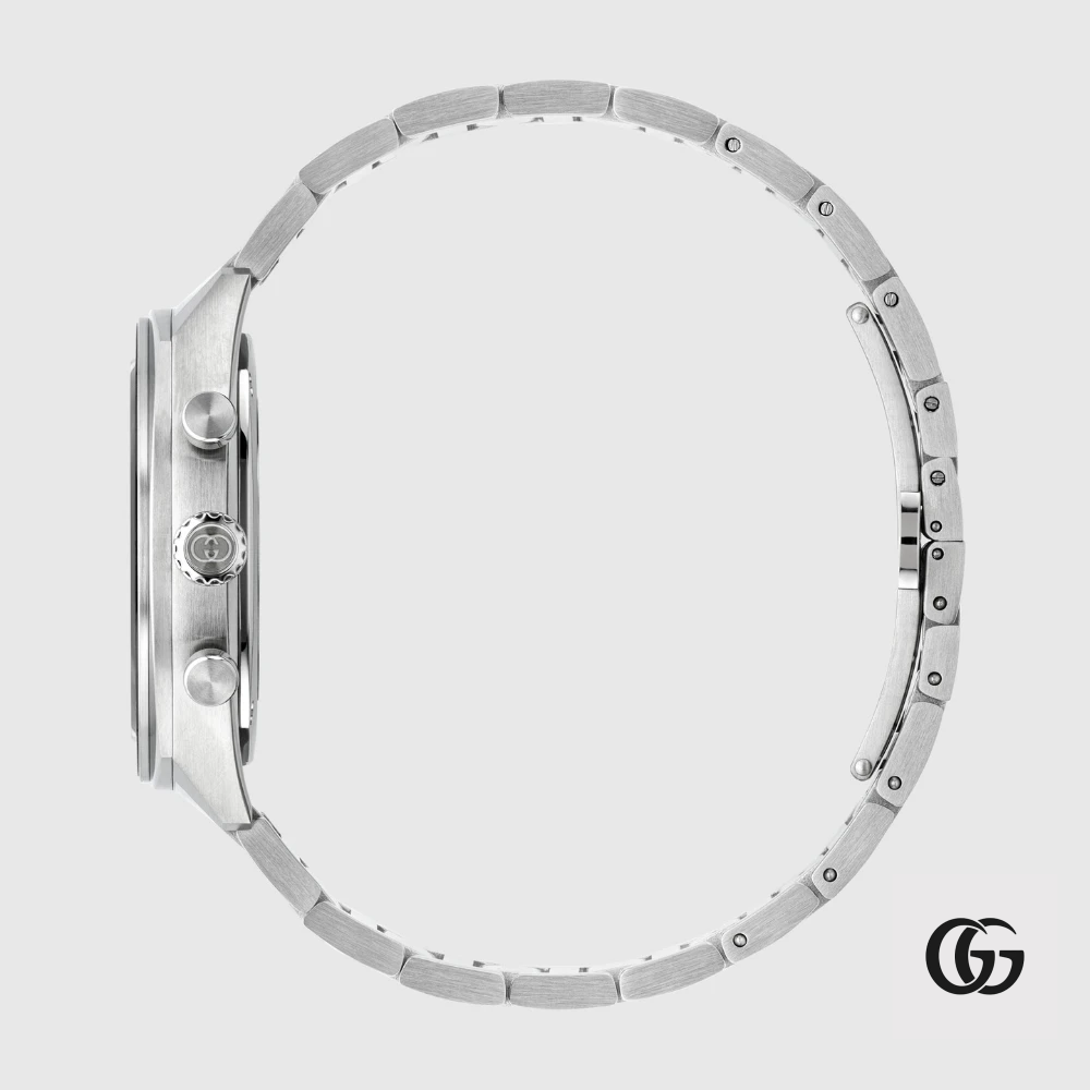 Vỏ và dây đeo bằng thép không gỉ tông màu bạc. Vòng bezel gốm tông màu bạc có thang đo tốc độ cố định. Mặt số màu đen với kim và vạch chỉ giờ tông màu bạc. Vạch chỉ phút xung quanh vành ngoài. Kiểu mặt số: Analog. Kim và vạch chỉ giờ phát quang. Chronograph - ba mặt số phụ hiển thị: 60 giây, 30 phút và 12 giờ. Bộ máy thạch anh. Tinh thể sapphire chống xước. Mặt sau vỏ đồng hồ chắc chắn. Hình dạng vỏ tròn, kích thước vỏ: 41 mm. Khóa gập có chốt an toàn. Chống nước ở độ sâu 100 mét / 330 feet. Chức năng: chronograph, ngày, giờ, phút, giây. Dòng G lồng vào nhau. Kiểu đồng hồ thể thao. Nhãn đồng hồ: Swiss Made.