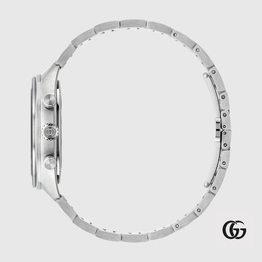 Vỏ thép không gỉ 41mm, mặt số màu xanh lam, màn hình hiển thị giây nhỏ Interlocking G, vành gốm đen có chỉ báo tốc độ, dây đeo bằng thép không gỉ