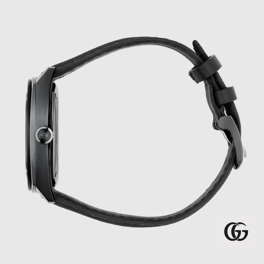 Vỏ thép không gỉ 41mm với lớp phủ PVD màu đen, mặt số màu đen, màn hình hiển thị giây nhỏ Interlocking G, vành PVD màu đen và dây cao su màu đen với hiệu ứng dệt