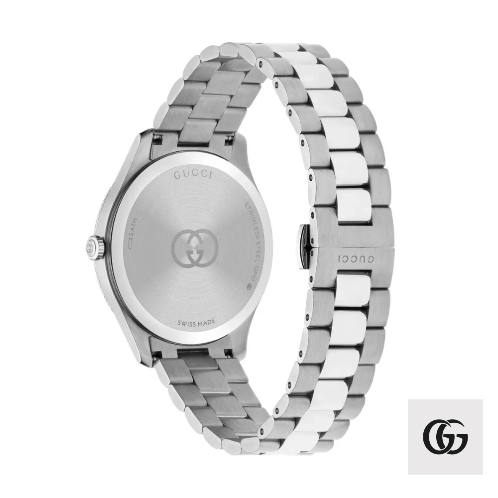 Dòng sản phẩm G-Timeless tiếp tục định hình những bộ sưu tập mới nhất, làm nổi bật những họa tiết đặc trưng của thương hiệu. Được trang bị bộ máy thạch anh, phụ kiện này sở hữu dây đeo bằng thép không gỉ với mặt số mạ vàng. Biểu tượng G lồng vào nhau tạo điểm nhấn logo mềm mại cho sản phẩm. Vỏ thép không gỉ 38mm, mặt số mạ vàng với biểu tượng G lồng vào nhau, cửa sổ ngày ở vị trí 3 giờ và dây đeo bằng thép không gỉ. Mặt kính sapphire phủ lớp chống phản quang. Độ sâu 5 ATM (50 mét/164 feet). Bộ máy thạch anh. Kích thước cổ tay từ 4,9" đến 7,6". Sản xuất tại Thụy Sĩ