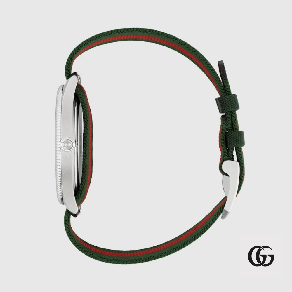 Dòng G-Timeless tiếp tục định hình các bộ sưu tập mới nhất, làm nổi bật các họa tiết đặc trưng của Nhà. Được trình bày với dây đeo bằng nylon màu xanh lá cây và đỏ, phụ kiện này có vỏ thép không gỉ và mặt số màu bạc được tô điểm bằng các mã biểu tượng.