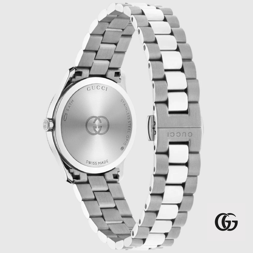 Trong bộ sưu tập mới nhất, dòng G-Timeless được tái hiện với bảng màu tươi mới, làm nổi bật những họa tiết đặc trưng của thương hiệu. Được trang bị bộ máy quartz, chiếc đồng hồ này sở hữu dây đeo bằng thép không gỉ và mặt số màu xanh lam. Vỏ thép không gỉ 29mm. Mặt số màu xanh lam điểm xuyết hai viên kim cương, chi tiết chữ G lồng vào nhau và dòng chữ Gucci. Mặt kính sapphire phủ lớp chống phản quang. Dây đeo bằng thép không gỉ. Bộ máy quartz. Độ chịu nước 5 ATM (50 mét/164 feet). Kích thước cổ tay từ 4,7" đến 7,6". Sản xuất tại Thụy Sĩ
