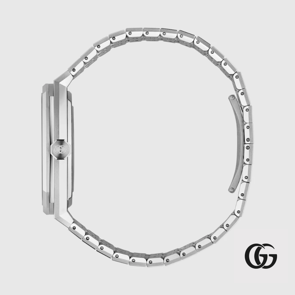 Bộ sưu tập GUCCI 25H mới nhất sở hữu thiết kế tinh tế, với những chi tiết tinh tế làm nổi bật thiết kế thanh lịch của đồng hồ. Được trang bị bộ máy tự động, phụ kiện này nổi bật với dây đeo bằng thép có thể thay thế và vỏ thép không gỉ mặt số màu đen. Vỏ thép không gỉ nhiều lớp 40mm. Mặt số màu đen với chi tiết chữ G lồng vào nhau và logo Gucci. Mặt kính sapphire phủ lớp chống phản quang. Dây đeo bằng thép không gỉ có thể thay thế. Bộ máy tự động. Độ chịu nước 5 ATM (50 mét/164 feet). Dự trữ năng lượng: 38 giờ. Kích thước cổ tay từ 5,7" đến 7,8".