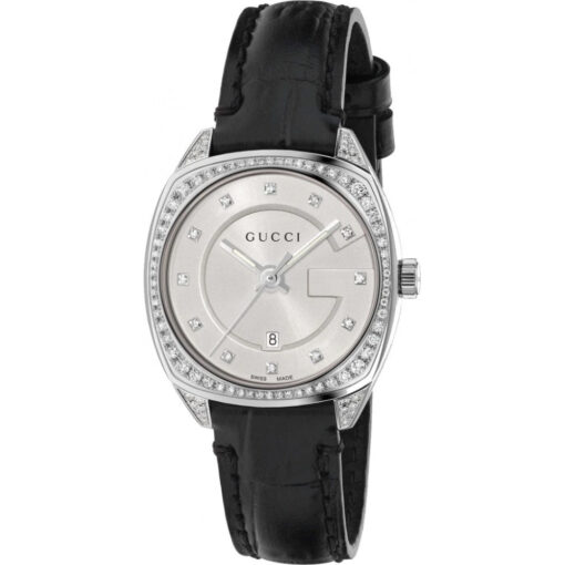 Vỏ thép không gỉ tông bạc với dây đeo bằng da màu đen. Vành thép không gỉ tông bạc cố định. Mặt số tông bạc với kim đồng hồ và vạch chỉ giờ kim cương. Hiển thị ngày ở vị trí 6 giờ. Bộ máy thạch anh. Nắp lưng chắc chắn. Kiểu dáng vỏ đệm, kích thước vỏ: 29 mm. Khả năng chống nước ở độ sâu 50 mét / 165 feet. Chức năng: ngày, giờ, phút, giây. Dòng GG2570. Kiểu dáng đồng hồ thanh lịch. Nhãn đồng hồ: Sản xuất tại Thụy Sĩ. Gucci GG2570 Mặt số kim cương tông bạc dành cho nữ.