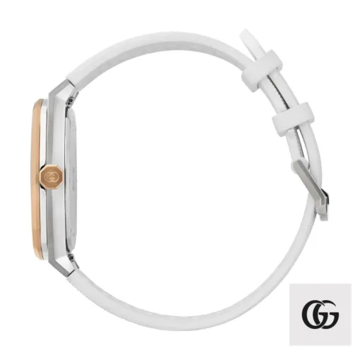ộ sưu tập GUCCI 25H mới nhất sở hữu thiết kế tinh tế, với những chi tiết tinh tế làm nổi bật thiết kế thanh lịch của đồng hồ. Được trang bị bộ máy quartz, phụ kiện này nổi bật với dây đeo cao su trắng có thể thay thế và vỏ thép không gỉ với mặt số màu bạc. Vỏ thép không gỉ 36mm nhiều lớp. Viền mạ vàng hồng, mặt số màu bạc, chi tiết chữ G lồng vào nhau, logo Gucci và ô mở ngày. Mặt kính sapphire phủ lớp chống phản quang. Dây đeo cao su trắng có thể thay thế. Bộ máy quartz. 5 ATM (50 mét/164 feet). Kích thước cổ tay từ 5,5" đến 7,2".